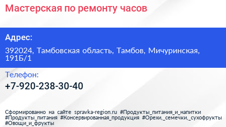 Мастерская по ремонту часов по адресу 392024, Тамбовская область, Тамбов, Мичуринская, 191Б/1 в дальнейшем Организация, размещена в следующих категориях: