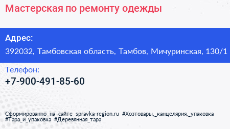 Мастерская по ремонту одежды по адресу 392032, Тамбовская область, Тамбов, Мичуринская, 130/1 в дальнейшем Организация, размещена в следующих категориях:
