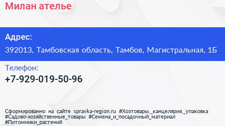 Милан, ателье по адресу 392013, Тамбовская область, Тамбов, Магистральная, 1Б в дальнейшем Организация, размещена в следующих категориях: