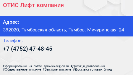ОТИС Лифт, компания по адресу 392020, Тамбовская область, Тамбов, Мичуринская, 24 в дальнейшем Организация, размещена в следующих категориях: