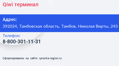 Qiwi, терминал по адресу 392024, Тамбовская область, Тамбов, Николая Вирты, 243 в дальнейшем Организация, размещена в следующих категориях: