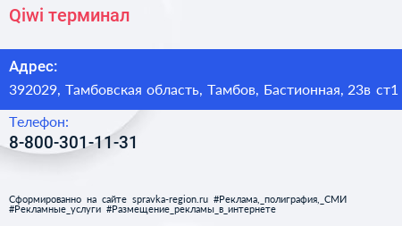 Qiwi, терминал по адресу 392029, Тамбовская область, Тамбов, Бастионная, 23в ст1 в дальнейшем Организация, размещена в следующих категориях: