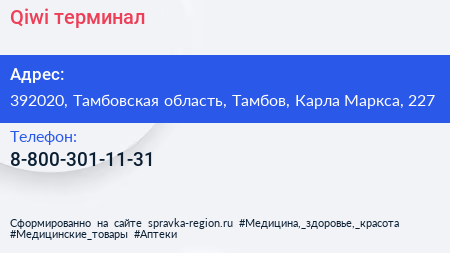 Qiwi, терминал по адресу 392020, Тамбовская область, Тамбов, Карла Маркса, 227 в дальнейшем Организация, размещена в следующих категориях: