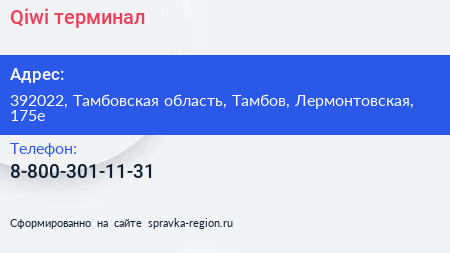 Qiwi, терминал по адресу 392022, Тамбовская область, Тамбов, Лермонтовская, 175е в дальнейшем Организация, размещена в следующих категориях: