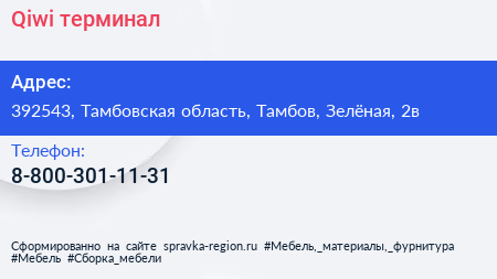 Qiwi, терминал по адресу 392543, Тамбовская область, Тамбов, Зелёная, 2в в дальнейшем Организация, размещена в следующих категориях: