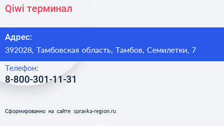 Qiwi, терминал по адресу 392028, Тамбовская область, Тамбов, Семилетки, 7 в дальнейшем Организация, размещена в следующих категориях: