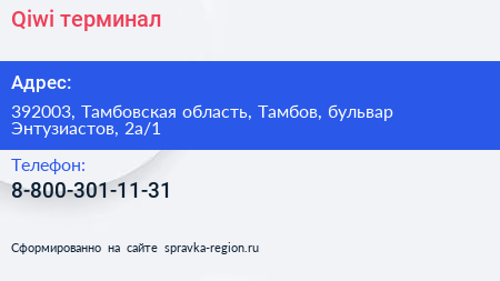 Qiwi, терминал по адресу 392003, Тамбовская область, Тамбов, бульвар Энтузиастов, 2а/1 в дальнейшем Организация, размещена в следующих категориях: