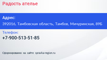 Радость, ателье по адресу 392016, Тамбовская область, Тамбов, Мичуринская, 89Б в дальнейшем Организация, размещена в следующих категориях: