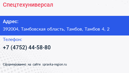 Спецтехуниверсал по адресу 392004, Тамбовская область, Тамбов, Тамбов 4, 2 в дальнейшем Организация, размещена в следующих категориях: