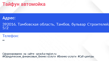 Тайфун, автомойка по адресу 392016, Тамбовская область, Тамбов, бульвар Строителей, 5/2 в дальнейшем Организация, размещена в следующих категориях: