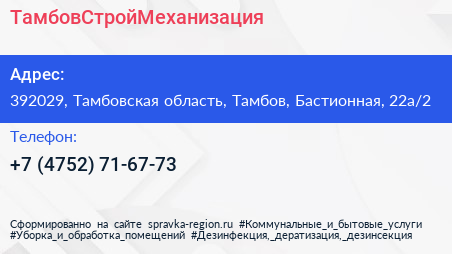ТамбовСтройМеханизация по адресу 392029, Тамбовская область, Тамбов, Бастионная, 22а/2 в дальнейшем Организация, размещена в следующих категориях: