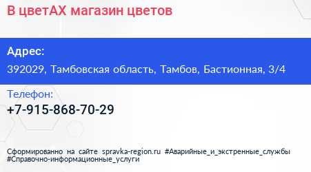 В цветАХ, магазин цветов по адресу 392029, Тамбовская область, Тамбов, Бастионная, 3/4 в дальнейшем Организация, размещена в следующих категориях: