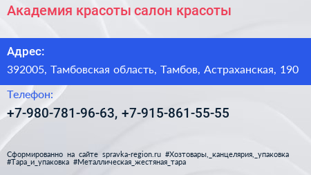 Академия красоты, салон красоты по адресу 392005, Тамбовская область, Тамбов, Астраханская, 190 в дальнейшем Организация, размещена в следующих категориях: