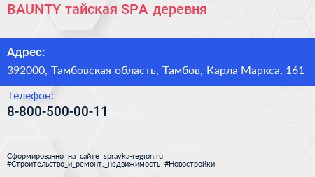 BAUNTY, тайская SPA-деревня по адресу 392000, Тамбовская область, Тамбов, Карла Маркса, 161 в дальнейшем Организация, размещена в следующих категориях: