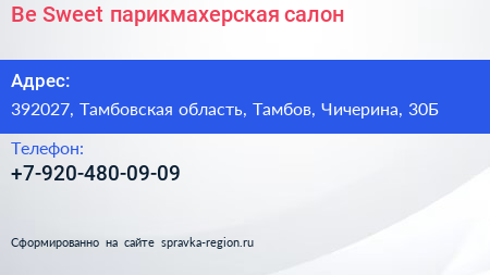 Be Sweet, парикмахерская-салон по адресу 392027, Тамбовская область, Тамбов, Чичерина, 30Б в дальнейшем Организация, размещена в следующих категориях:
