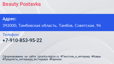 Beauty Postavka по адресу 392000, Тамбовская область, Тамбов, Советская, 96 в дальнейшем Организация, размещена в следующих категориях: