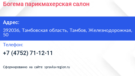 Богема, парикмахерская-салон по адресу 392036, Тамбовская область, Тамбов, Железнодорожная, 50 в дальнейшем Организация, размещена в следующих категориях: