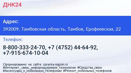 ДНК24 по адресу 392009, Тамбовская область, Тамбов, Ерофеевская, 22 в дальнейшем Организация, размещена в следующих категориях: