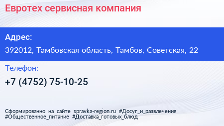 Евротех, сервисная компания по адресу 392012, Тамбовская область, Тамбов, Советская, 22 в дальнейшем Организация, размещена в следующих категориях: