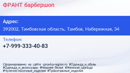 ФРАНТ, барбершоп по адресу 392002, Тамбовская область, Тамбов, Набережная, 34 в дальнейшем Организация, размещена в следующих категориях: