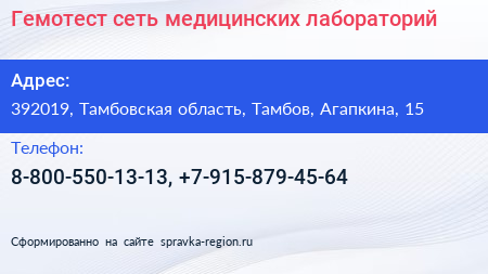 Гемотест, сеть медицинских лабораторий по адресу 392019, Тамбовская область, Тамбов, Агапкина, 15 в дальнейшем Организация, размещена в следующих категориях: