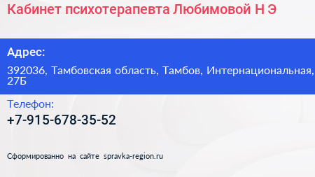 Кабинет психотерапевта Любимовой Н.Э. по адресу 392036, Тамбовская область, Тамбов, Интернациональная, 27Б в дальнейшем Организация, размещена в следующих категориях: