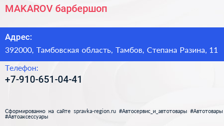 MAKAROV, барбершоп по адресу 392000, Тамбовская область, Тамбов, Степана Разина, 11 в дальнейшем Организация, размещена в следующих категориях: