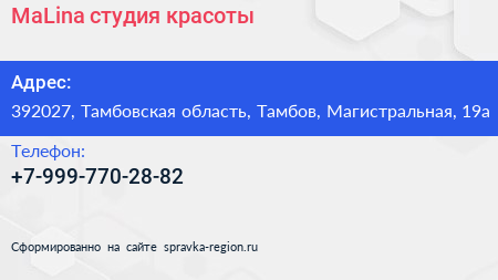 MaLina, студия красоты по адресу 392027, Тамбовская область, Тамбов, Магистральная, 19а в дальнейшем Организация, размещена в следующих категориях: