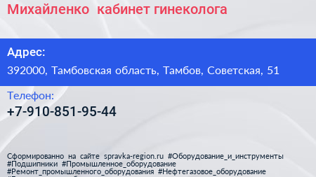 Михайленко+, кабинет гинеколога по адресу 392000, Тамбовская область, Тамбов, Советская, 51 в дальнейшем Организация, размещена в следующих категориях: