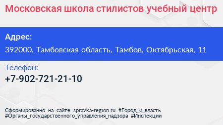 Московская школа стилистов, учебный центр по адресу 392000, Тамбовская область, Тамбов, Октябрьская, 11 в дальнейшем Организация, размещена в следующих категориях: