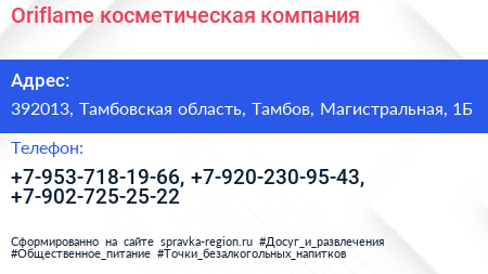 Oriflame, косметическая компания по адресу 392013, Тамбовская область, Тамбов, Магистральная, 1Б в дальнейшем Организация, размещена в следующих категориях: