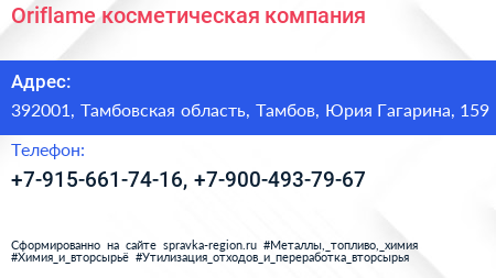 Oriflame, косметическая компания по адресу 392001, Тамбовская область, Тамбов, Юрия Гагарина, 159 в дальнейшем Организация, размещена в следующих категориях:
