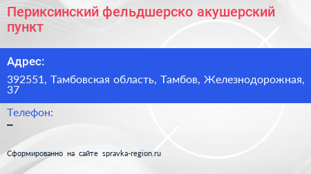 Периксинский фельдшерско-акушерский пункт по адресу 392551, Тамбовская область, Тамбов, Железнодорожная, 37 в дальнейшем Организация, размещена в следующих категориях: