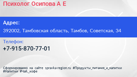 Психолог Осипова А.Е. по адресу 392002, Тамбовская область, Тамбов, Советская, 34 в дальнейшем Организация, размещена в следующих категориях: