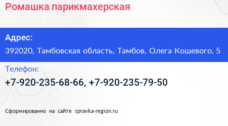 Ромашка, парикмахерская по адресу 392020, Тамбовская область, Тамбов, Олега Кошевого, 5 в дальнейшем Организация, размещена в следующих категориях: