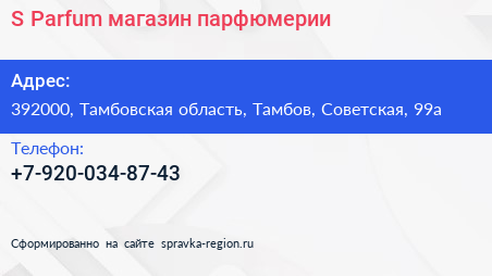 S Parfum, магазин парфюмерии по адресу 392000, Тамбовская область, Тамбов, Советская, 99а в дальнейшем Организация, размещена в следующих категориях: