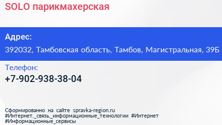SOLO, парикмахерская по адресу 392032, Тамбовская область, Тамбов, Магистральная, 39Б в дальнейшем Организация, размещена в следующих категориях: