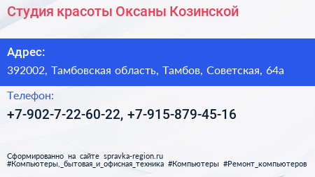 Студия красоты Оксаны Козинской по адресу 392002, Тамбовская область, Тамбов, Советская, 64а в дальнейшем Организация, размещена в следующих категориях: