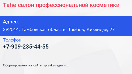 Tahe, салон профессиональной косметики по адресу 392014, Тамбовская область, Тамбов, Киквидзе, 27 в дальнейшем Организация, размещена в следующих категориях: