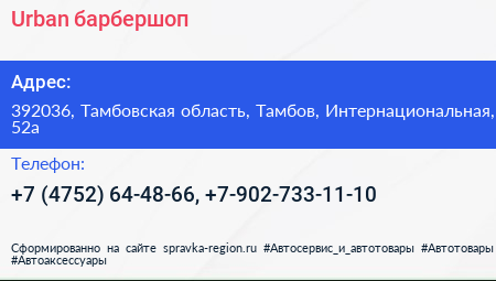 Urban, барбершоп по адресу 392036, Тамбовская область, Тамбов, Интернациональная, 52а в дальнейшем Организация, размещена в следующих категориях: