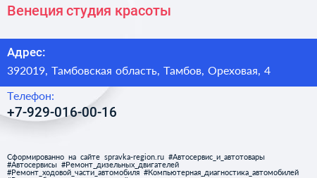 Венеция, студия красоты по адресу 392019, Тамбовская область, Тамбов, Ореховая, 4 в дальнейшем Организация, размещена в следующих категориях: