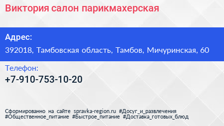 Виктория, салон-парикмахерская по адресу 392018, Тамбовская область, Тамбов, Мичуринская, 60 в дальнейшем Организация, размещена в следующих категориях: