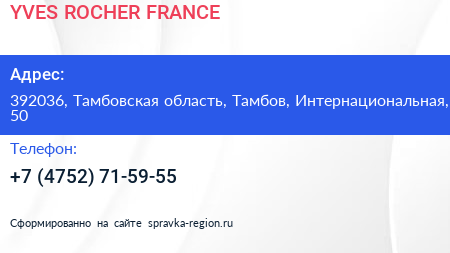 YVES ROCHER FRANCE по адресу 392036, Тамбовская область, Тамбов, Интернациональная, 50 в дальнейшем Организация, размещена в следующих категориях: