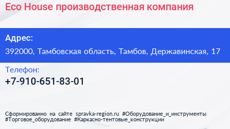 Eco House, производственная компания по адресу 392000, Тамбовская область, Тамбов, Державинская, 17 в дальнейшем Организация, размещена в следующих категориях: