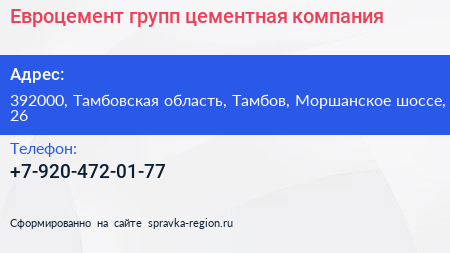 Евроцемент групп, цементная компания по адресу 392000, Тамбовская область, Тамбов, Моршанское шоссе, 26 в дальнейшем Организация, размещена в следующих категориях: