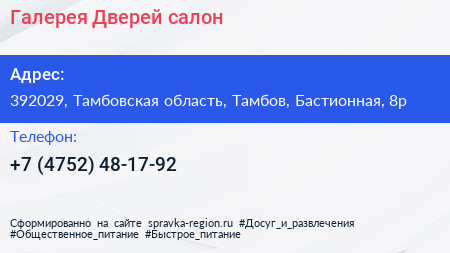 Галерея Дверей, салон по адресу 392029, Тамбовская область, Тамбов, Бастионная, 8р в дальнейшем Организация, размещена в следующих категориях: