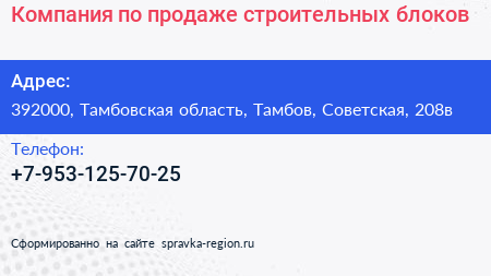 Компания по продаже строительных блоков по адресу 392000, Тамбовская область, Тамбов, Советская, 208в в дальнейшем Организация, размещена в следующих категориях:
