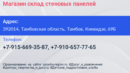 Магазин-склад стеновых панелей по адресу 392014, Тамбовская область, Тамбов, Киквидзе, 69Б в дальнейшем Организация, размещена в следующих категориях: