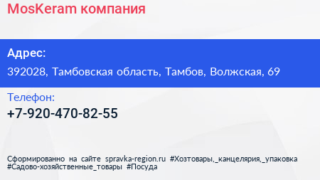 MosKeram, компания по адресу 392028, Тамбовская область, Тамбов, Волжская, 69 в дальнейшем Организация, размещена в следующих категориях: