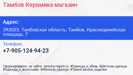 Тамбов-Керамика, магазин по адресу 392023, Тамбовская область, Тамбов, Красноармейская площадь, 7 в дальнейшем Организация, размещена в следующих категориях: